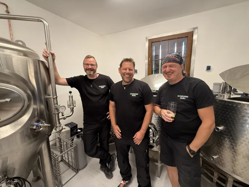 Marco, Timo und Stefan arbeiten hauptberuflich als Informatikspezialisten im gleichen Büro eines großen Coburger Versicherungsunternehmens mit drei Buchstaben. Schon lange sind sie auch privat dick befreundet. Im Januar 2022 beschlossen sie an Marcos Geburtstagsfeier aus einer Bierlaune heraus, ihr Bier künftig selbst zu brauen. Eines der Bilder zeigt die drei bei ihrem ersten Brauversuch überhaupt. Bis zu 200 Liter darf das eigentlich jeder - und so stand ersten Experimenten nichts im Weg. Im Nebenjob bei Hennemann (Stublang), mehreren Brauerkursen bei hiesigen Brauereien und durch Fachbücher und Fachzeitschriften erwarben die Jungs von Scheunenbräu nach und nach das Wissen, das sie brauchten.