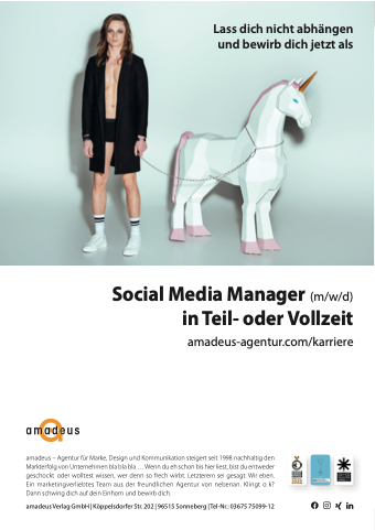amadeus – Agentur für Marke, Design und Kommunikation steigert seit 1998 nachhaltig den Markterfolg von Unternehmen bla bla bla ... Wenn du eh schon bis hier liest, bist du entweder geschockt oder wolltest wissen, wer denn so frech wirbt. Letzterem sei gesagt: Wir eben. Ein marketingverliebtes Team aus der freundlichen Agentur von nebenan. Klingt o. k? Dann schwing dich auf dein Einhorn und bewirb dich.