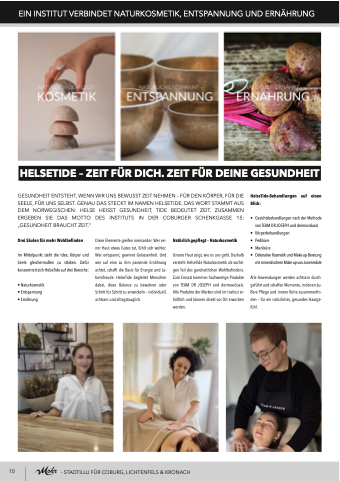 Diese Elemente greifen ineinander. Wer sei- ner Haut etwas Gutes tut, fühlt sich wohler. Wer entspannt, gewinnt Gelassenheit. Und wer auf eine zu ihm passende Ernährung achtet, schafft die Basis für Energie und Le- bensfreude. HelseTide begleitet Menschen dabei, diese Balance zu bewahren oder Schritt für Schritt zu entwickeln – individuell, achtsam und alltagstauglich.