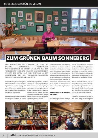 sen echte Thüringer Klöße sonn- und feiertags perfekt auf den Mittagstisch im grünen Baum. Kombiniert wird die Kartoffelspezialität mit ve- ganen Braten wie einer gefüllten Soja-Roula- de und "Rahm"-Soße, dem Linsenbraten oder Grünkernbraten, auf Wunsch auch mit Rot- kohl und auch mit Semmelknödel zu haben.