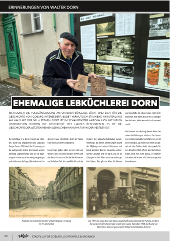 Historie der Lebkuchenfabrikation zusam- menhängt. Bei seinen Erinnerungen erzählt der 98jährige von seinen Erlebnissen und bringt zielsicher Namen, Ereignisse und be- kannte Coburger Orte ins Spiel, die wir als Coburger in den 50ern noch nie vorher ge- hört haben. Dies gilt vor allem für Namen