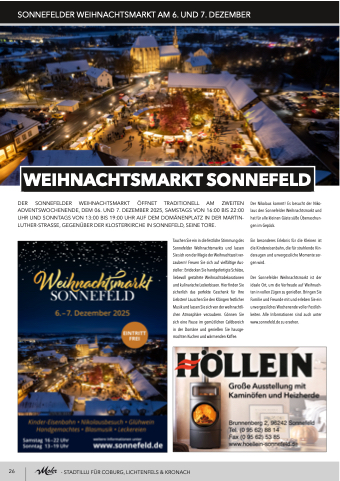 Der Sonnefelder Weihnachtsmarkt ist der ideale Ort, um die Vorfreude auf Weihnach- ten in vollen Zügen zu genießen. Bringen Sie Familie und Freunde mit und erleben Sie ein unvergessliches Wochenende voller Festlich- keiten. Alle Informationen sind auch unter www.sonnefeld.de zu ersehen.