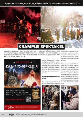 Darüber hinaus gibt es in den Alpen aber auch die alte Sagengestalt der „Perchta“. Als Figur ist sie im Spätmittelalter im Zusam- menhang mit dem Fest der Erscheinung des Herren entstanden. Teile der Sage haben aber wiederum Bezüge zur vorchristlichen Zeit. Klingt kompliziert? Ist es auch! Der Krampuslauf hat eine lange Tradition im Al- pen- und Alpenvorland. In der Adventszeit laufen unheimliche, wild aussehende Gestal- ten durch die Dörfer und Städte dieser Land- striche.