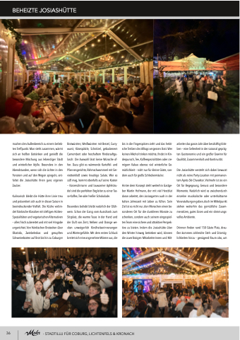 machen den Außenbereich zu einem belieb- ten Treffpunkt. Man steht zusammen, wärmt sich an heißen Getränken und genießt die besondere Mischung aus lebendiger Stadt und winterlicher Idylle. Besonders in den Abendstunden, wenn sich die Lichter in den Fenstern und auf den Wegen spiegeln, ent- faltet die Josiashütte ihren ganz eigenen Zauber.