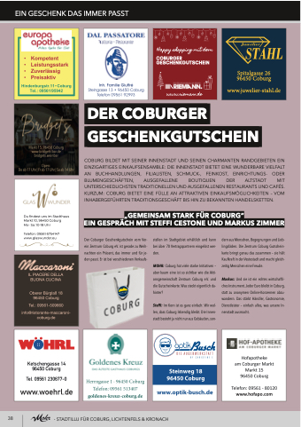 Markus: Und sie ist ein echtes wirtschaftli- ches Instrument. Jeder Euro bleibt in Coburg, statt zu anonymen Online-Konzernen abzu- wandern. Das stärkt Händler, Gastronomie, Dienstleister – einfach alles, was unsere In- nenstadt ausmacht.