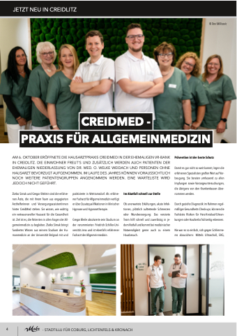 AM 6. OKTOBER ERÖFFNETE DIE HAUSARZTPRAXIS CREIDMED IN DER EHEMALIGEN VR-BANK IN CREIDLITZ. DIE EINWOHNER FREUT'S UND ZUSÄTZLICH WERDEN AUCH PATIENTEN DER EHEMALIGEN NIEDERLASSUNG VON DR. MED. O. WELKE WEIDACH UND PERSONEN OHNE HAUSARZT BEVORZUGT AUFGENOMMEN. IM LAUFE DES JAHRES KÖNNEN VORAUSSICHTLICH NOCH WEITERE PATIENTENGRUPPEN ANGENOMMEN WERDEN. EINE WARTELISTE WIRD JEDOCH NICHT GEFÜHRT.