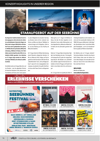 Das Bayreuther Seebühnenfestival hat sich in den vergangenen Jahren als eines der schöns- ten und beliebtesten Festivals der Region eta- bliert. Auch im August 2026 dürfen sich Besu- cher*innen auf ein spektakuläres Line-up freu- en: Mit Max Herre & Joy Denalane, Melissa Na- schenweng, Heißmann & Rassau, Gert Stein- bäcker sowie den Sportfreunden Stiller ist mu- sikalische Vielfalt garantiert. Zum Abschluss am 14. August steigt erstmals ein elektroni- scher Tag mit Westbam, Anna Reusch und Mar- kus Kavka.