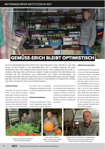ER IST IN WEITRAMSDORF EINE INSTITUTION: ERICH REICHELT, KURZ „DER ERICH“ UND SEIN STAND IN DER ORTSMITTE VON WEITRAMSDORF. SEIT 12 JAHREN VERKAUFT ER DORT HEIMISCHES OBST UND GEMÜSE SOWIE SPEZIALITÄTEN. DOCH INZWISCHEN SIEHT DER 71- JÄHRIGE, DEM MAN SEIN ALTER KAUM ANSIEHT, DUNKLE WOLKEN FÜR SEINE BERUFLICHE EXISTENZ AM ORT AUFZIEHEN: „DIE KUNDSCHAFT HAT STARK NACHGELASSEN. DIE STAMMKUNDSCHAFT BESTEHT HAUPTSÄCHLICH AUS ÄLTEREN PERSONEN, UND DIE STERBEN MIR WEG. VON DER JUNGEN GENERATION SEHE ICH NUR WENIGE. ICH WEISS NICHT VORAN DAS LIEGT. KOCHEN IST WOHL NICHT MEHR IN MODE.“