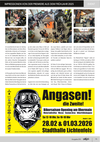 ge Jahre neben seiner Messe in Fürth und Neumarkt organisiert. Für das Jahr 2024 hat er sich dann von der Organisation zurückge- zogen. Für das neue Format "Angasen" zeich- net nun Heiko Bayerlieb, der Herausgeber des Stadt- und Szenemagazines Mohr stadtil- lu verantwortlich. "Es war super zu sehen, wie im letzten Jahr die Premiere von den Besu- chern angenommen wurde. In diesem Jahr präsntieren sich noch mehr Motorradhändler als im Frühjahr 2025" fügt er an. "Es freut mich ungemein, eigentlich alle wichtigen Motorradmarken verbunden mit unseren oberfränkischen Händlern unter einem Dach präsentieren zu können.