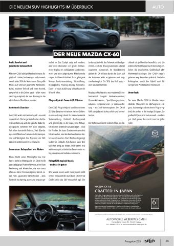 Mit dem CX-60 schlägt Mazda ein neues Ka- pitel auf: stärker, hochwertiger und souverä- ner als jedes SUV der Marke zuvor. Das große Mazda-SUV setzt auf japanische Handwerks- kunst, moderne Technik und einen Antrieb, der perfekt in die Zeiten passt – allen voran der Plug-in-Hybrid, der den Einstieg in die elektrifizierte Oberklasse markiert.