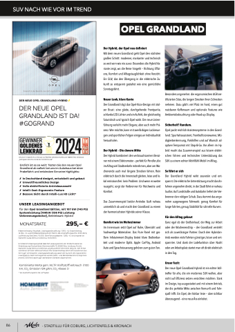 Mit dem neuen Grandland geht Opel den nächsten großen Schritt: moderner, markanter und technisch so weit vorn wie nie zuvor. Besonders die Hybrid-Va- riante zeigt, wo die Reise hingeht – Richtung Effizi- enz, Komfort und Alltagstauglichkeit ohne Verzicht. Ein SUV, das den Übergang in die elektrische Zu- kunft so entspannt gestaltet wie eine gemütliche Sonntagsfahrt.