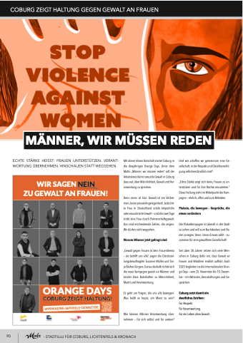 Seit über 30 Jahren setzen sich viele Men- schen in Coburg dafür ein, dass Gewalt an Frauen und Mädchen endlich aufhört. Auch 2025 begleiten sie die internationalen Oran- ge Days – vom 25. November bis 10. Dezem- ber – mit Aktionen, Veranstaltungen und Ge- sprächen.