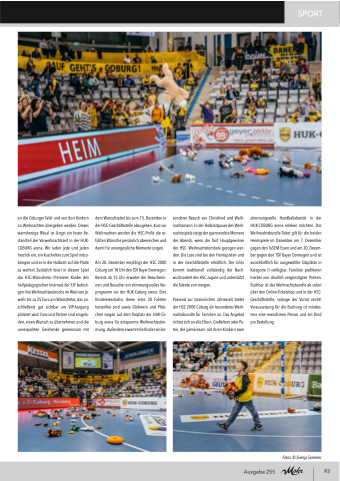 sonderer Besuch von Christkind und Weih- nachtsmann. In der Halbzeitpause des Weih- nachtsspiels steigt der spannendste Moment des Abends, wenn die fünf Hauptgewinne der HSC- Weihnachtstombola gezogen wer- den. Die Lose sind bei den Heimspielen und in der Geschäftsstelle erhältlich. Der Erlös kommt traditionell vollständig der Nach- wuchsarbeit des HSC zugute und unterstützt die Talente von morgen.