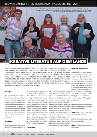 SEIT 2019 WIRD IN WEITRAMSDORF VON AN LITERATUR INTERESSIERTEN MENSCHEN KREATIV GESCHRIEBEN. BEGONNEN HAT DAS GANZE IN DER KÜCHE DES JOURNALISTEN CHRISTIAN GÖLLER. DORT BEGANN EINE GRUPPE, DER UNTER ANDEREM AUCH DIE MUNDARTDICHTERIN TRUDE WEISS ANGEHÖRTE, SICH REGELMÄSSIG ZU TREFFEN UND ZU VEREINBARTEN THEMEN TEXTE ZU ENTWERFEN. DAS PASSIERTE UNTER DEM DACH DER EVANGELISCHEN KIRCHENGEMEINDE. EINES WAR VON ANFANG AN KLAR: ES SOLLTE KEINERLEI VORGABEN GEBEN, WAS DIE LÄNGE ODER DAS GENRE DER VERFASSTEN ARBEITEN BETRAF. UND SO ENTSTAND EINE VIELZAHL VON KURZGESCHICHTEN, GEDICHTEN IN REIMFORM ODER FREIEN VERSEN UND ANDEREN LITERARISCHEN FORMEN.